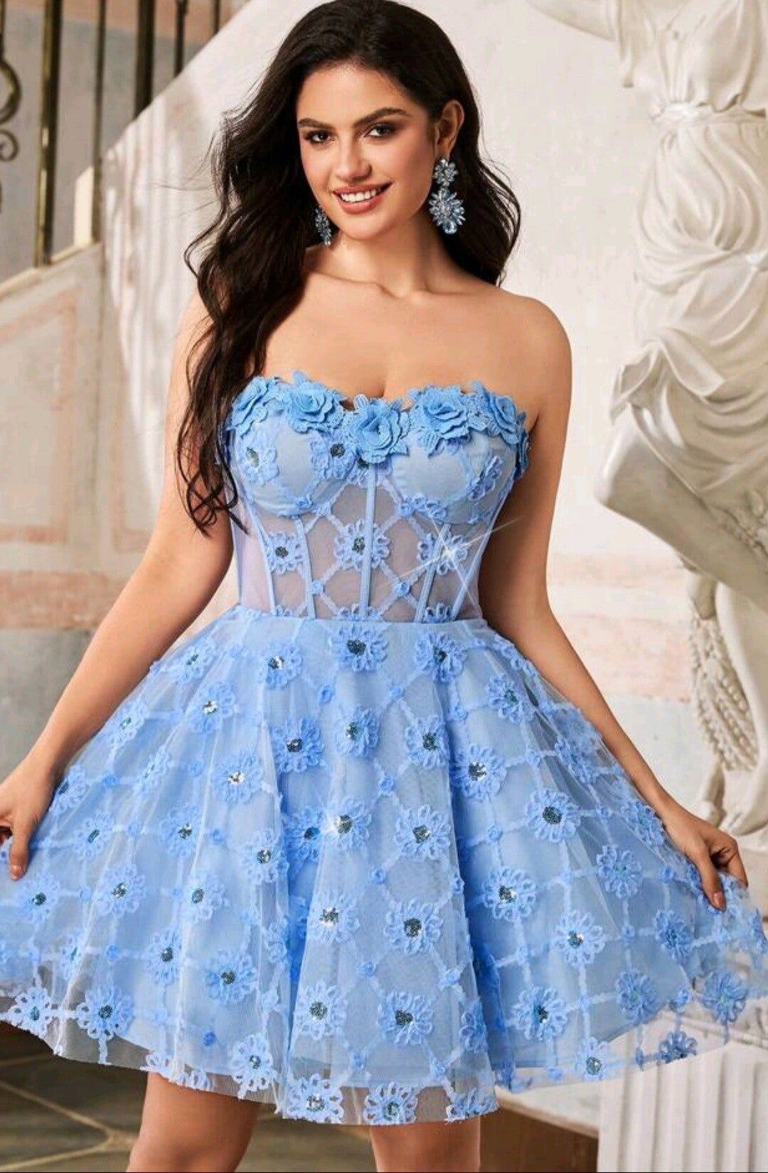 Elegant romantic cute fairy 3D embroidered fabric tube dress in blue, 3D flower decoration, herringbone waist, sheer drawstring, A-line, short princess dress, suitable for vacation, festivals, wedding guest, prom.
